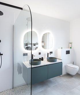 Een badkamer die rust en karakter uitstraalt. De combinatie van speels terrazzo, zachte groentinten en strakke zwarte accenten creëert een evenwichtige en eigentijdse sfeer. Organische spiegels met subtiele verlichting maken het geheel compleet.